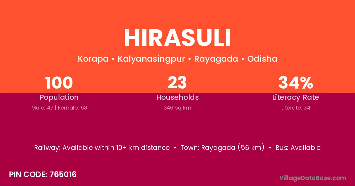 Rayagada (56 km) is the nearest town to Hirasuli village for major economic activities and is located approximately 56 km away.