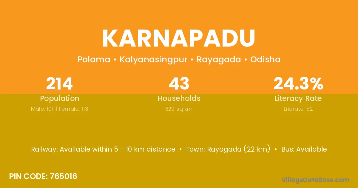 Rayagada (22 km) is the nearest town to Karnapadu village for major economic activities and is located approximately 22 km away.