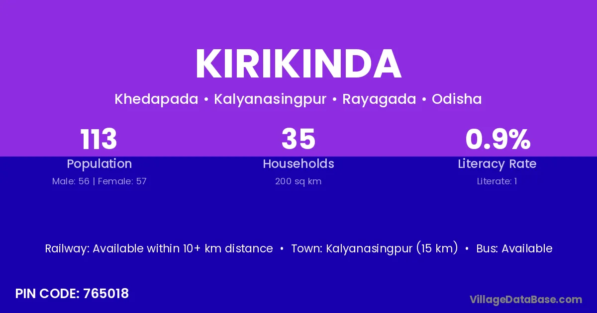 Kirikinda village has a total population of 113 people, of which 56 are males and 57 are females.