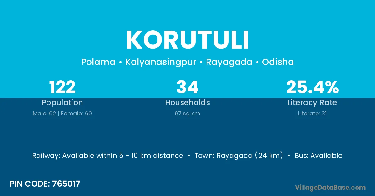 Rayagada (24 km) is the nearest town to Korutuli village for major economic activities and is located approximately 24 km away.