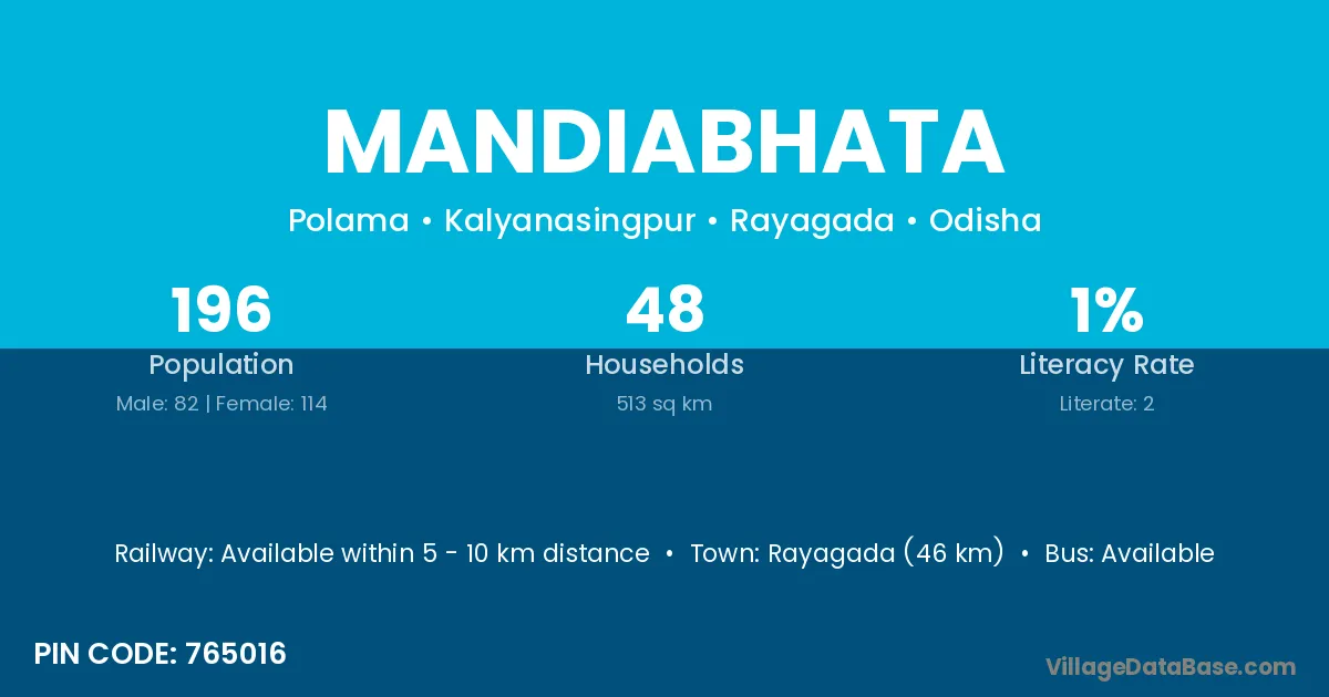 Rayagada (46 km) is the nearest town to Mandiabhata village for major economic activities and is located approximately 46 km away.