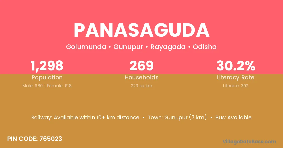 Rayagada (33 km) is the nearest town to Panasaguda village for major economic activities and is located approximately 33 km away.