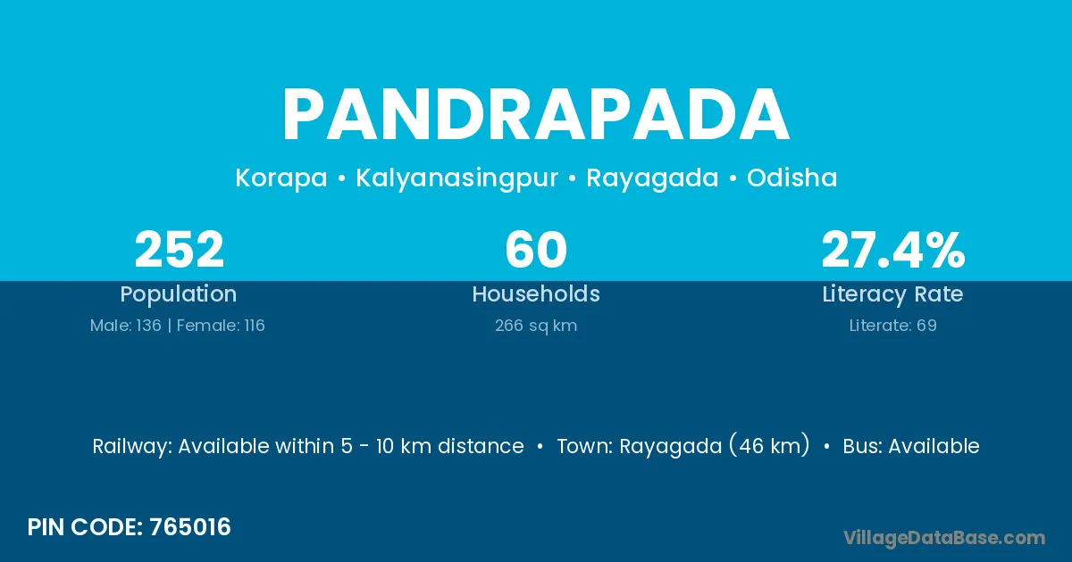 Rayagada (46 km) is the nearest town to Pandrapada village for major economic activities and is located approximately 46 km away.