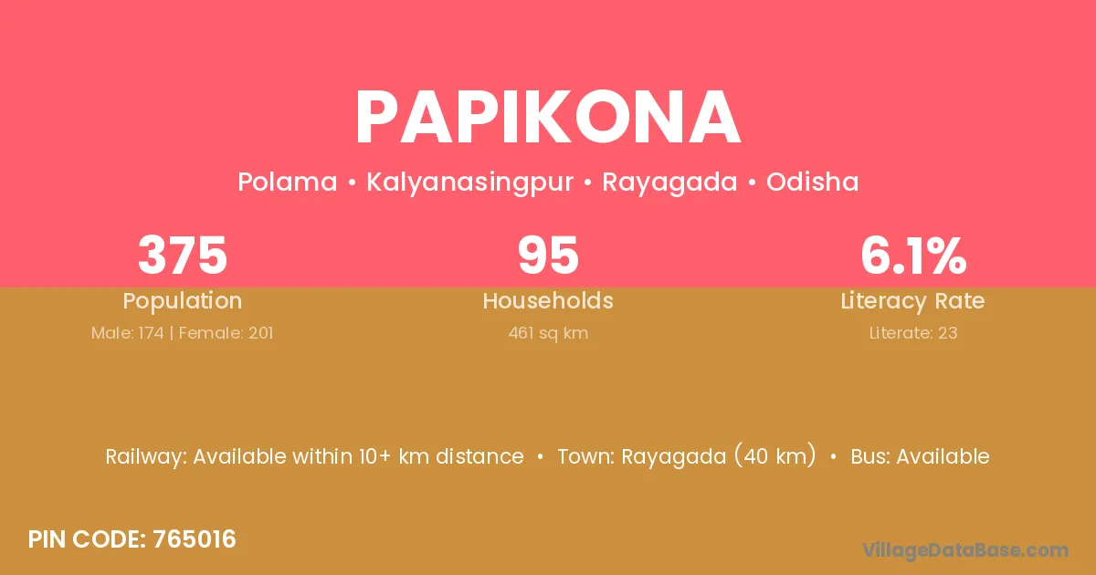 Rayagada (40 km) is the nearest town to Papikona village for major economic activities and is located approximately 40 km away.