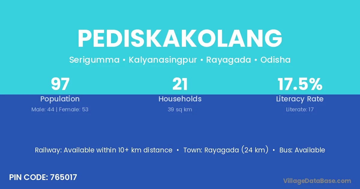 Rayagada (24 km) is the nearest town to Pediskakolang village for major economic activities and is located approximately 24 km away.