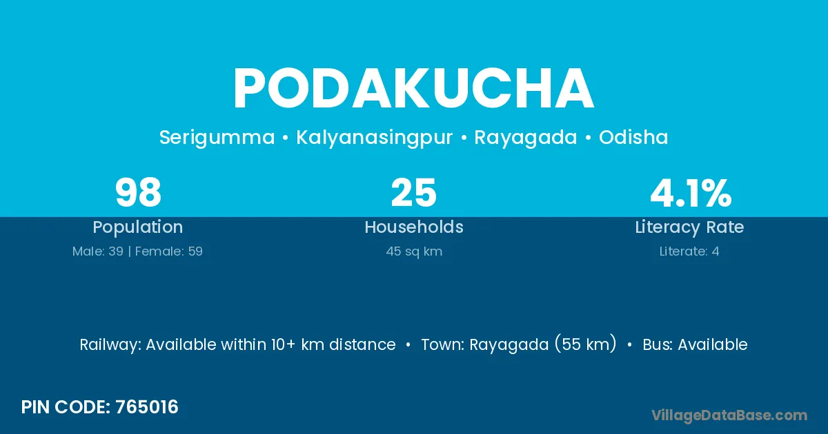 Rayagada (55 km) is the nearest town to Podakucha village for major economic activities and is located approximately 55 km away.