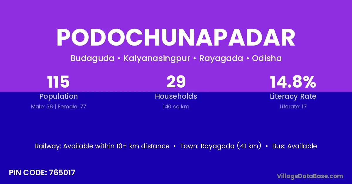 Rayagada (41 km) is the nearest town to Podochunapadar village for major economic activities and is located approximately 41 km away.