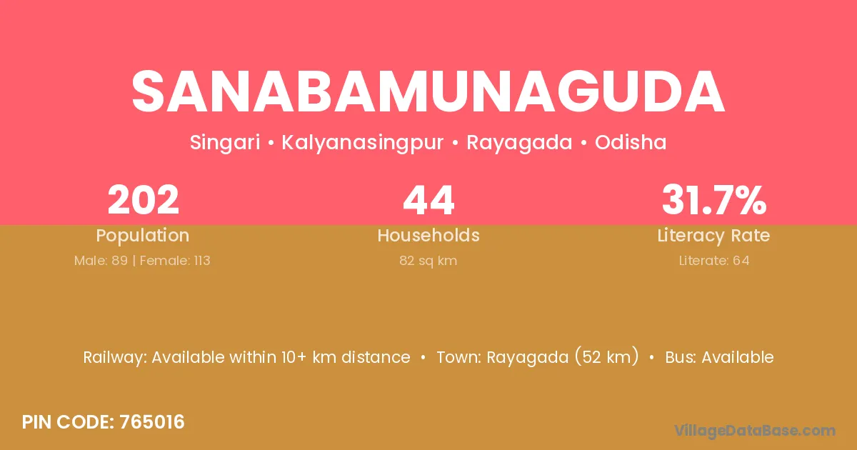 Rayagada (52 km) is the nearest town to Sanabamunaguda village for major economic activities and is located approximately 52 km away.
