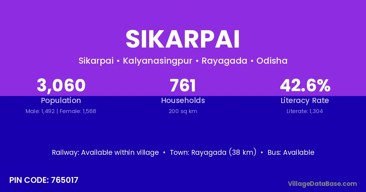 Rayagada (38 km) is the nearest town to Sikarpai village for major economic activities and is located approximately 38 km away.