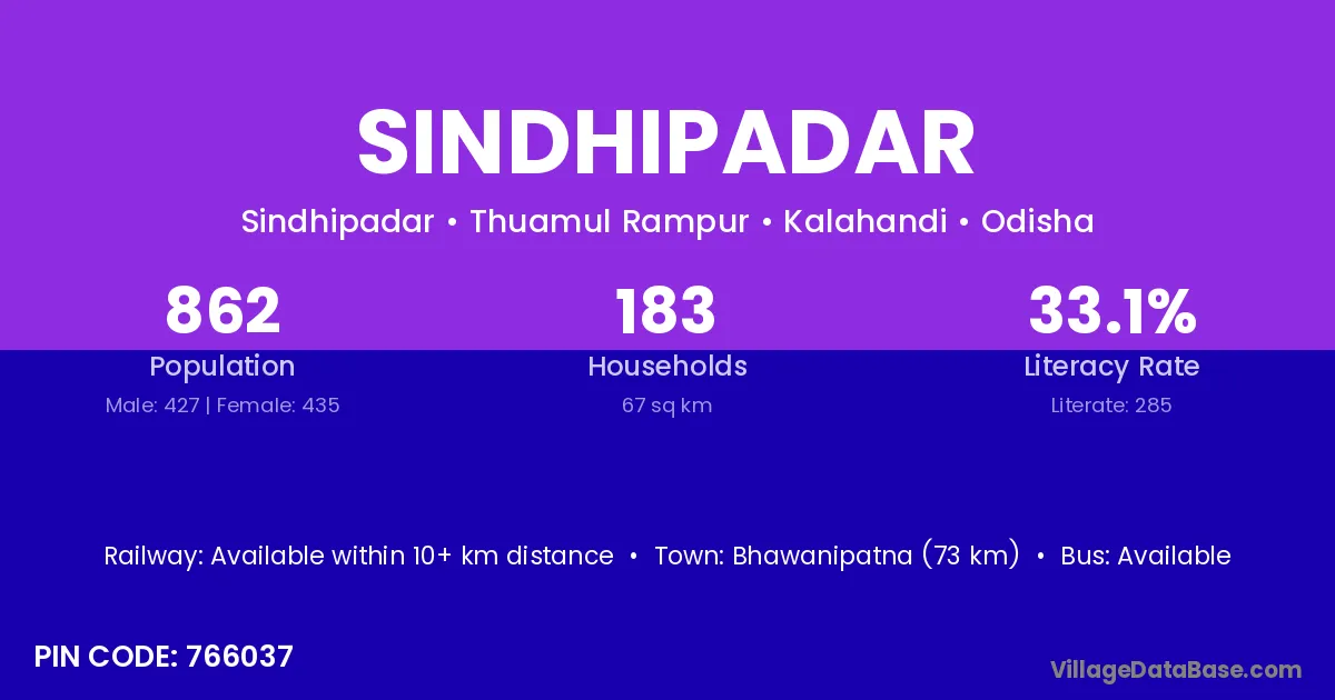 Rayagada (60 km) is the nearest town to Sindhipadar village for major economic activities and is located approximately 60 km away.