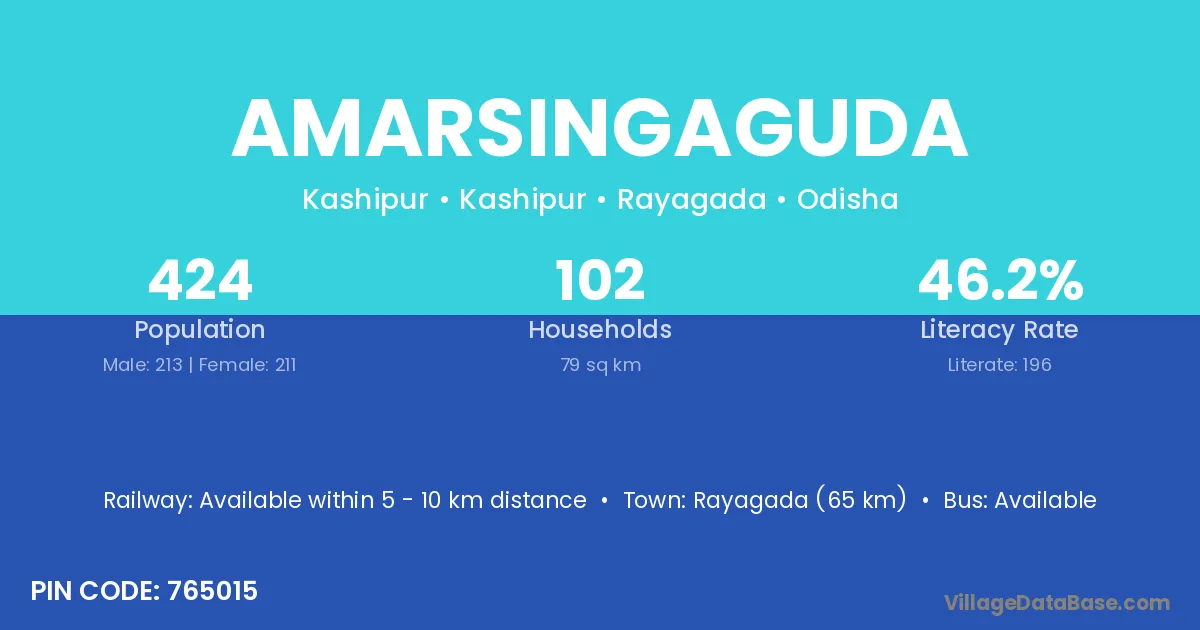 Rayagada (65 km) is the nearest town to Amarsingaguda village for major economic activities and is located approximately 65 km away.