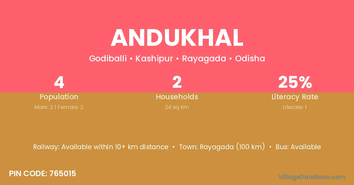 Rayagada (100 km) is the nearest town to Andukhal village for major economic activities and is located approximately 100 km away.