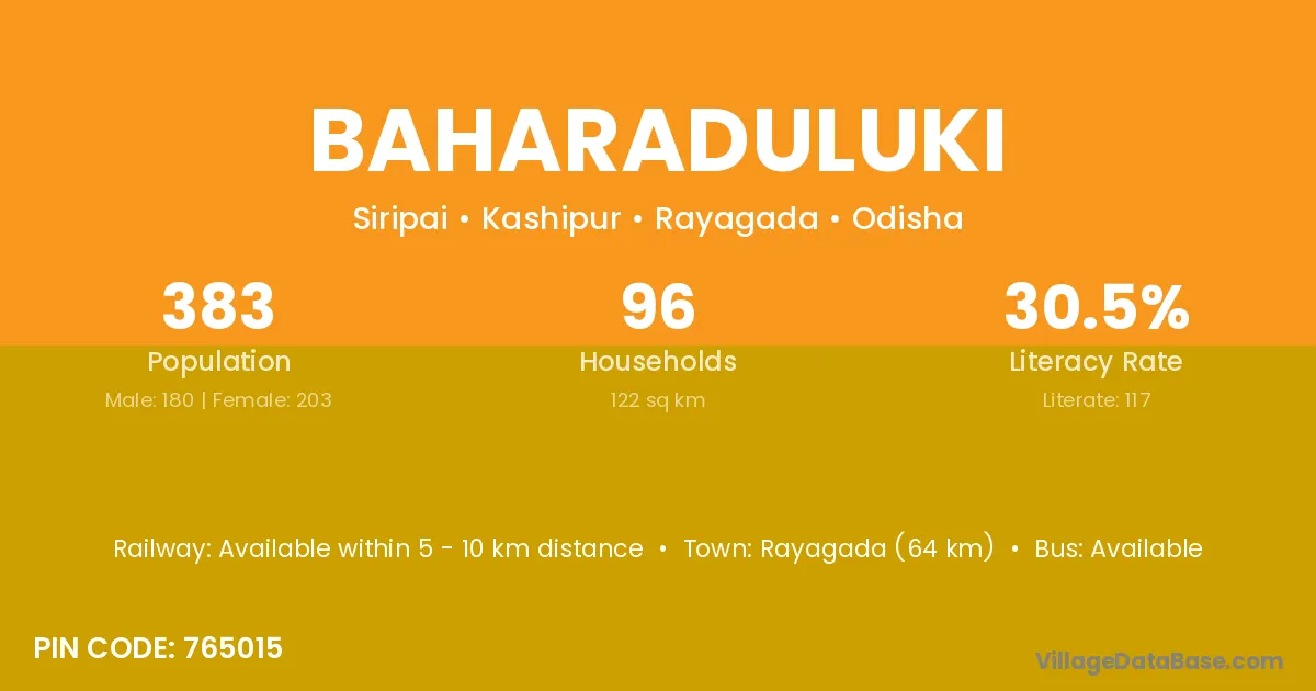 Rayagada (64 km) is the nearest town to Baharaduluki village for major economic activities and is located approximately 64 km away.