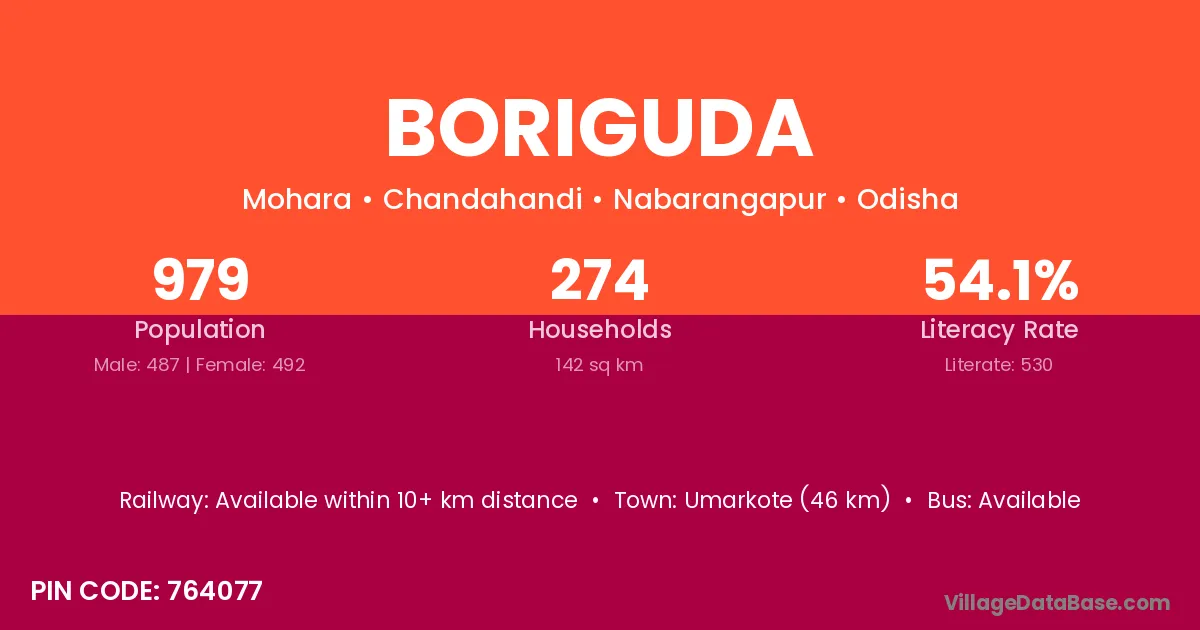 The literacy rate of Boriguda village is 12.20%. Male literacy stands at 16.67% and female literacy at 8.70%.