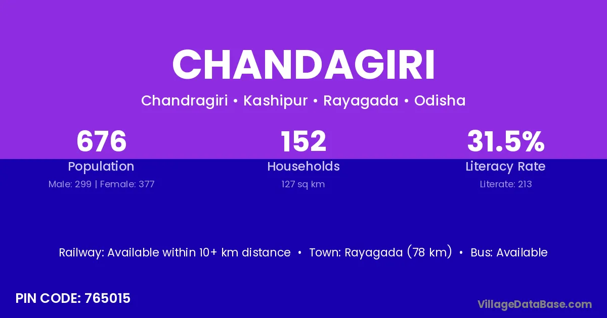 Rayagada (78 km) is the nearest town to Chandagiri village for major economic activities and is located approximately 78 km away.