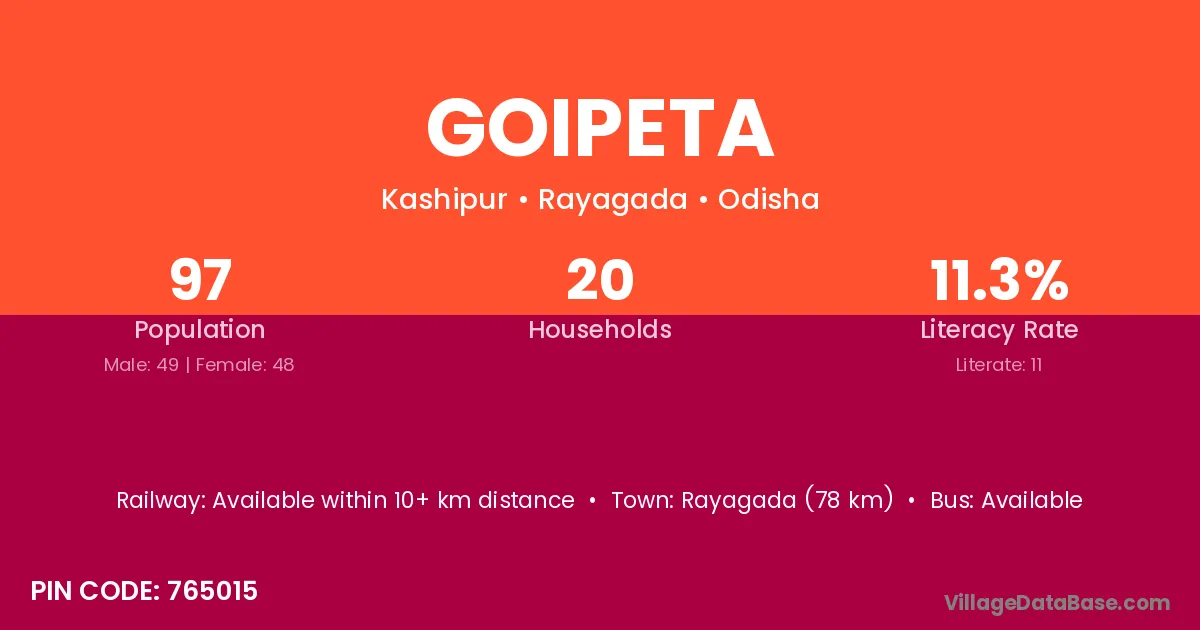 Rayagada (78 km) is the nearest town to Goipeta village for major economic activities and is located approximately 78 km away.