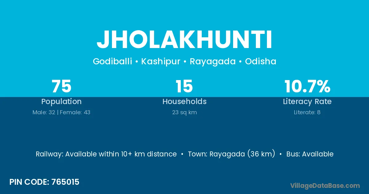 Rayagada (36 km) is the nearest town to Jholakhunti village for major economic activities and is located approximately 36 km away.