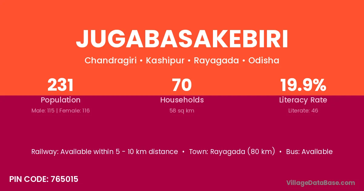 Jugabasakebiri village has a total population of 231 people, of which 115 are males and 116 are females.