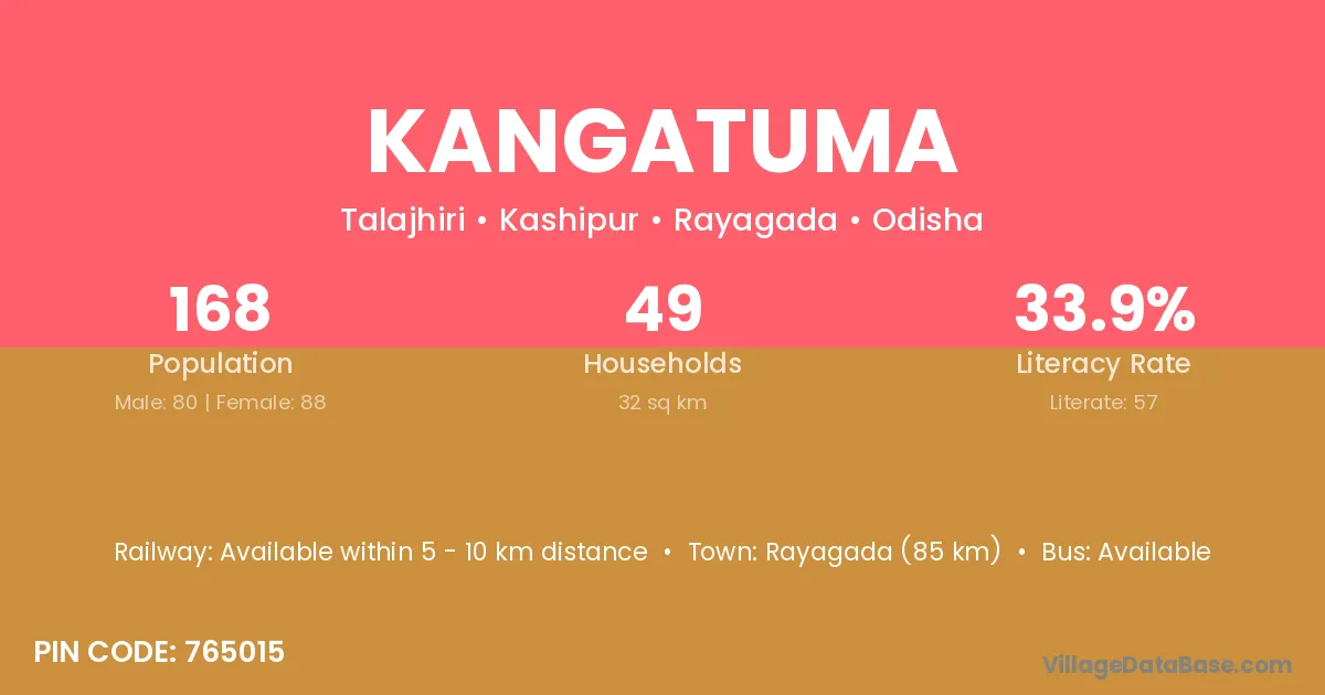 Rayagada (85 km) is the nearest town to Kangatuma village for major economic activities and is located approximately 85 km away.