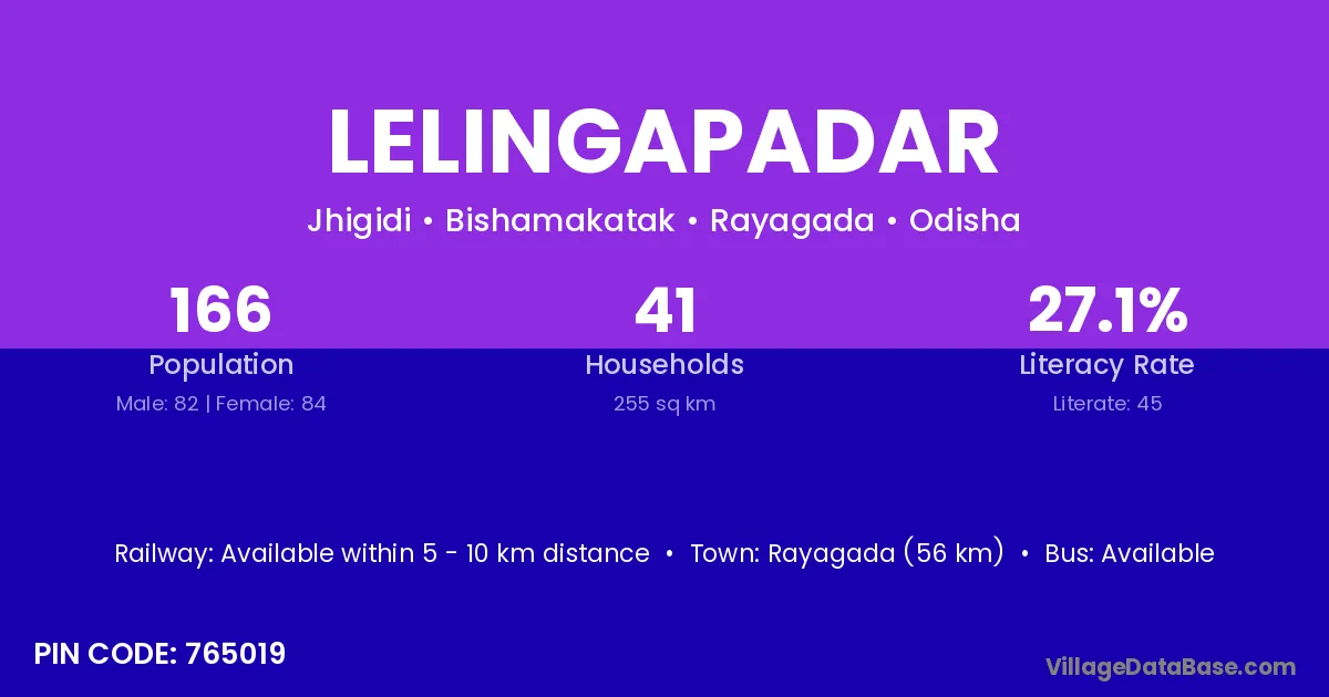 Rayagada (84 km) is the nearest town to Lelingapadar village for major economic activities and is located approximately 84 km away.