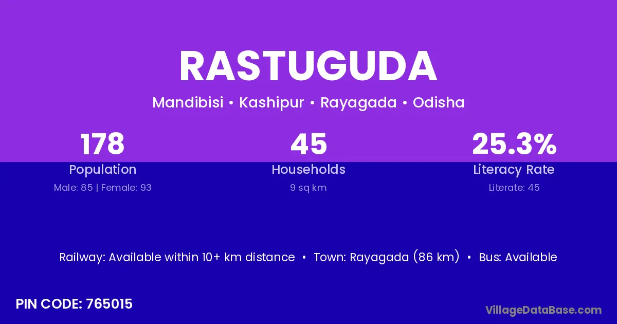 Rayagada (86 km) is the nearest town to Rastuguda village for major economic activities and is located approximately 86 km away.