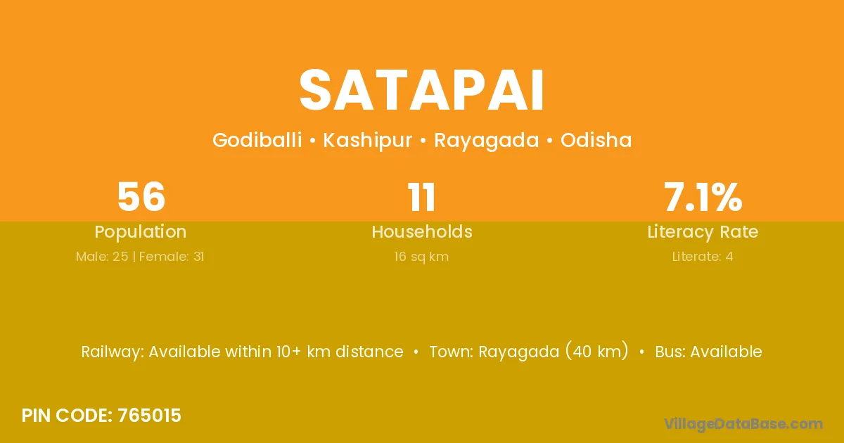 Rayagada (40 km) is the nearest town to Satapai village for major economic activities and is located approximately 40 km away.