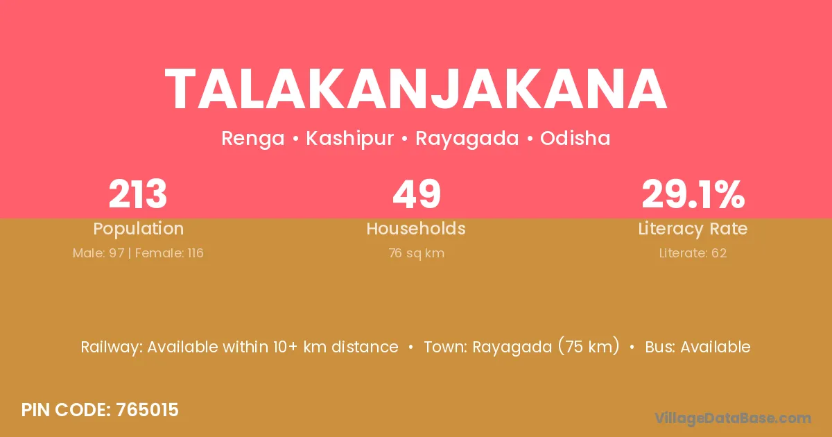 Rayagada (75 km) is the nearest town to Talakanjakana village for major economic activities and is located approximately 75 km away.