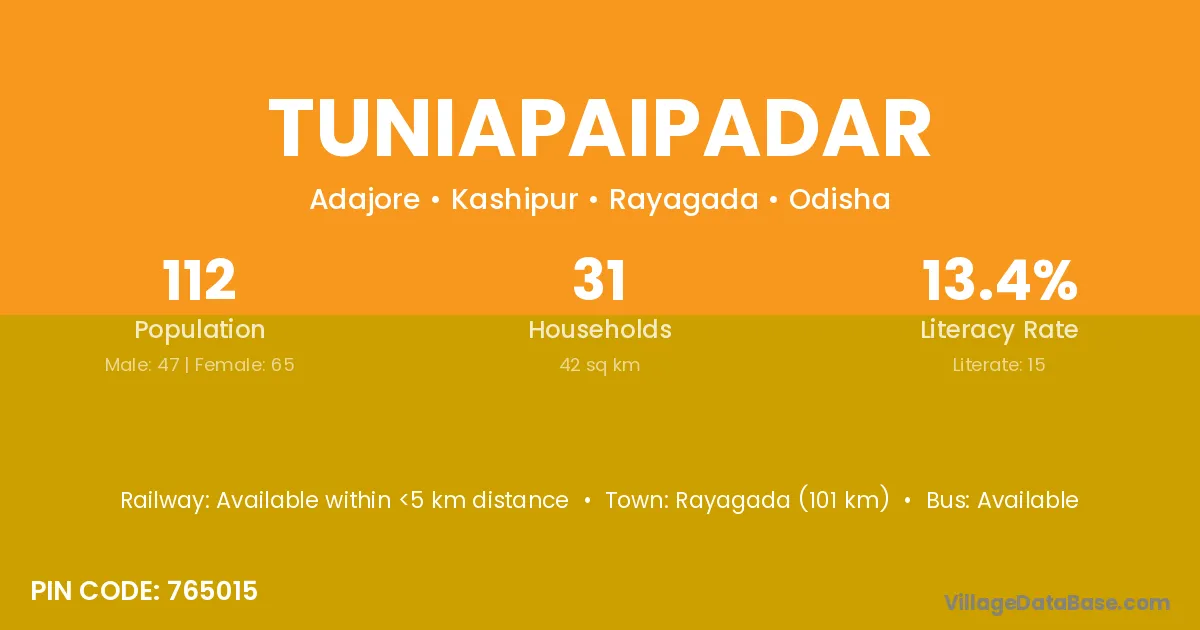 Rayagada (101 km) is the nearest town to Tuniapaipadar village for major economic activities and is located approximately 101 km away.