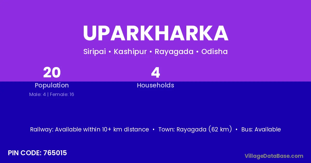 Rayagada (62 km) is the nearest town to Uparkharka village for major economic activities and is located approximately 62 km away.