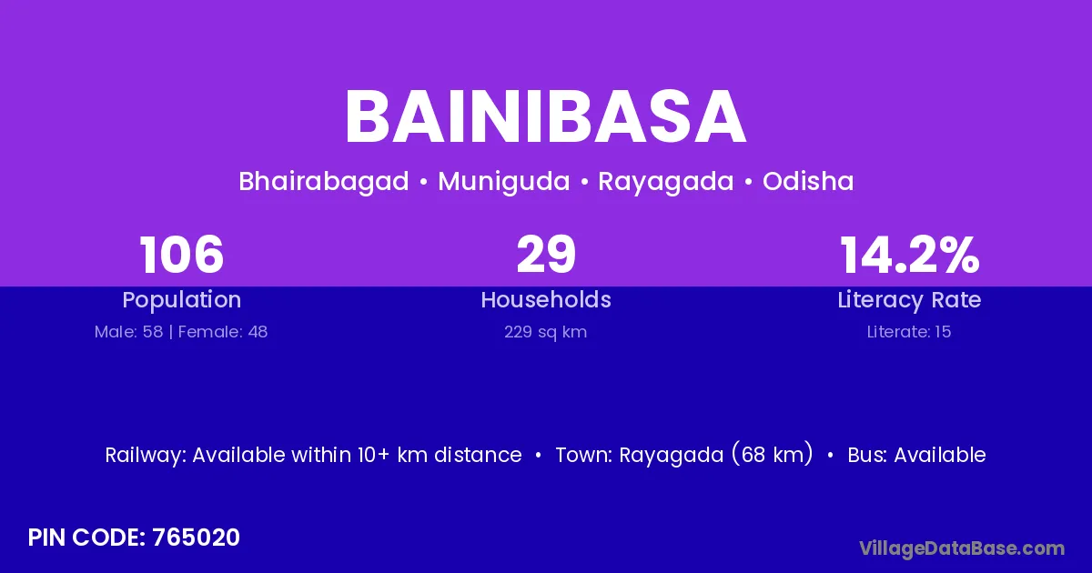 Rayagada (68 km) is the nearest town to Bainibasa village for major economic activities and is located approximately 68 km away.