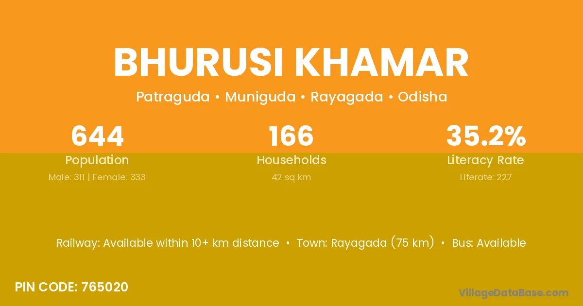 Rayagada (75 km) is the nearest town to Bhurusi Khamar village for major economic activities and is located approximately 75 km away.