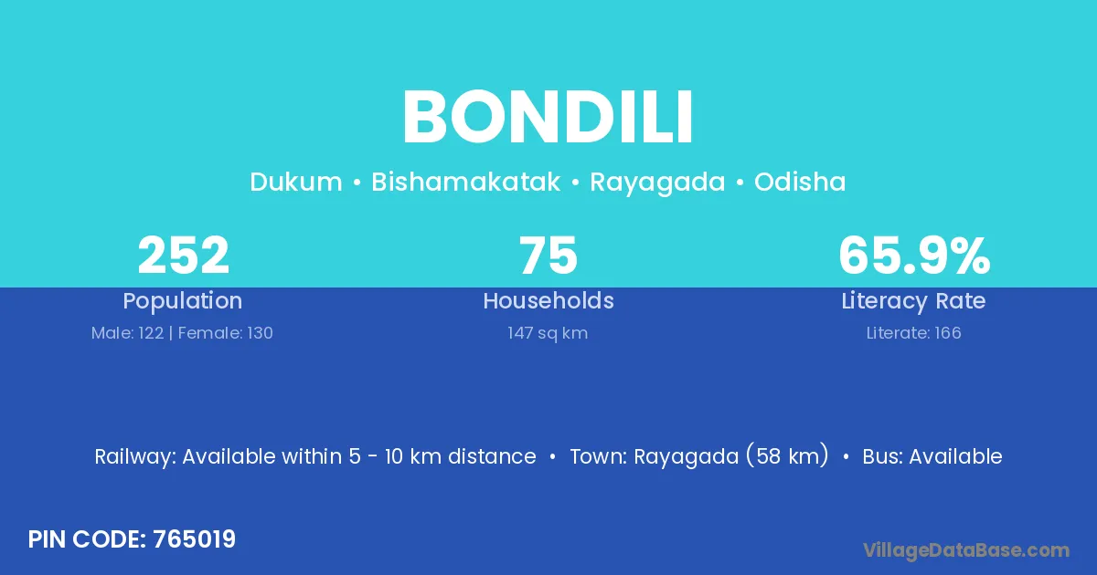 Rayagada (75 km) is the nearest town to Bondili village for major economic activities and is located approximately 75 km away.