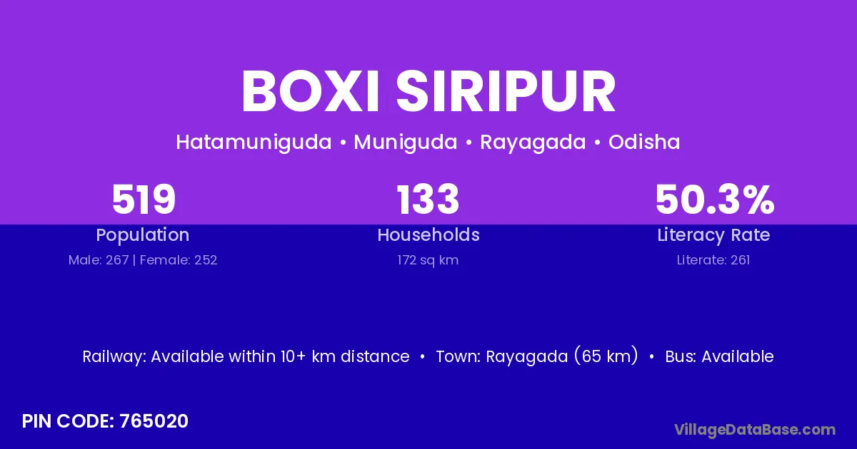 Rayagada (65 km) is the nearest town to Boxi Siripur village for major economic activities and is located approximately 65 km away.