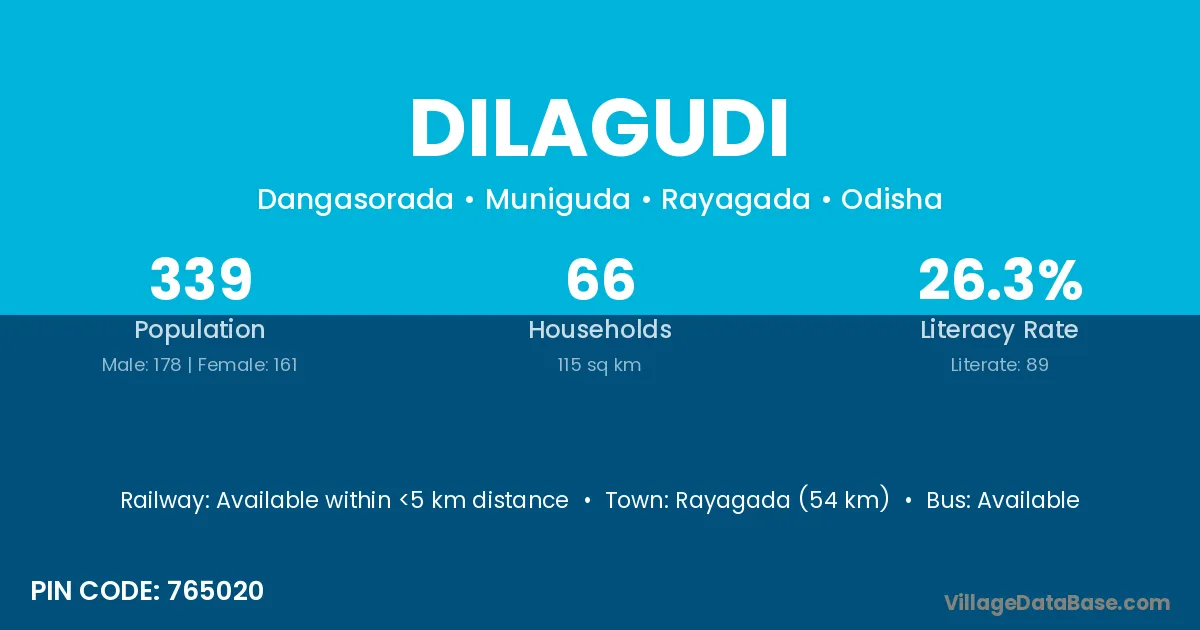 Rayagada (54 km) is the nearest town to Dilagudi village for major economic activities and is located approximately 54 km away.
