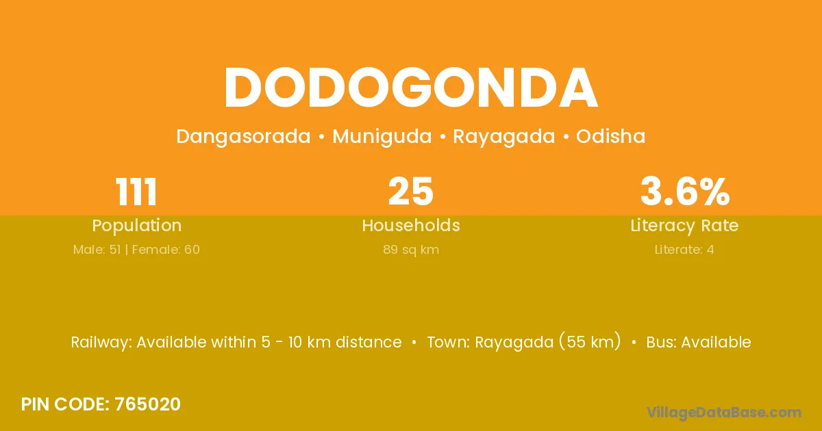 Rayagada (55 km) is the nearest town to Dodogonda village for major economic activities and is located approximately 55 km away.