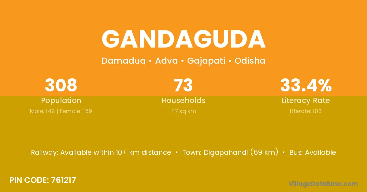 Rayagada (75 km) is the nearest town to Gandaguda village for major economic activities and is located approximately 75 km away.