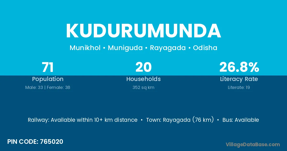 Rayagada (76 km) is the nearest town to Kudurumunda village for major economic activities and is located approximately 76 km away.