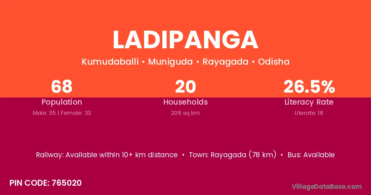 Rayagada (78 km) is the nearest town to Ladipanga village for major economic activities and is located approximately 78 km away.