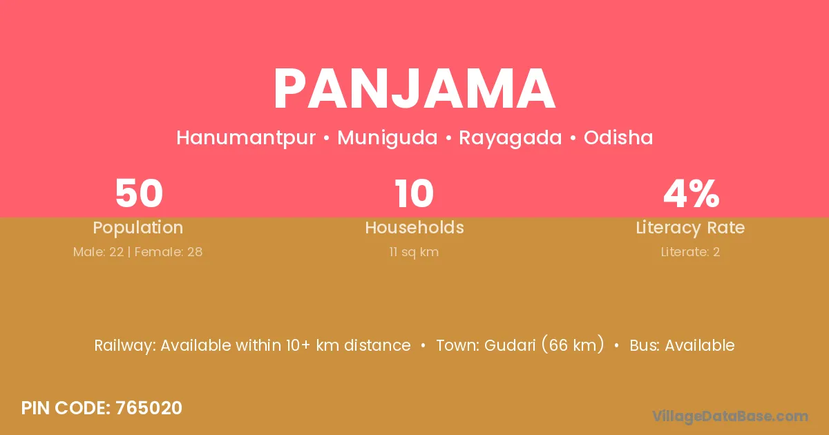 Panjama village has a total population of 50 people, of which 22 are males and 28 are females.
