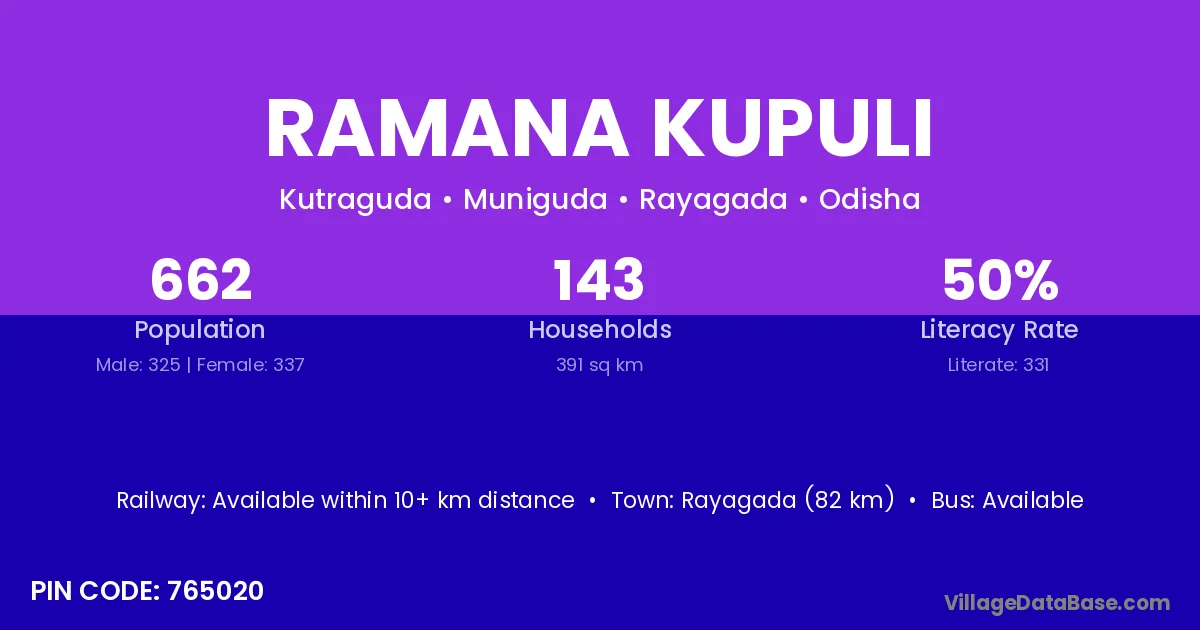 Rayagada (82 km) is the nearest town to Ramana Kupuli village for major economic activities and is located approximately 82 km away.