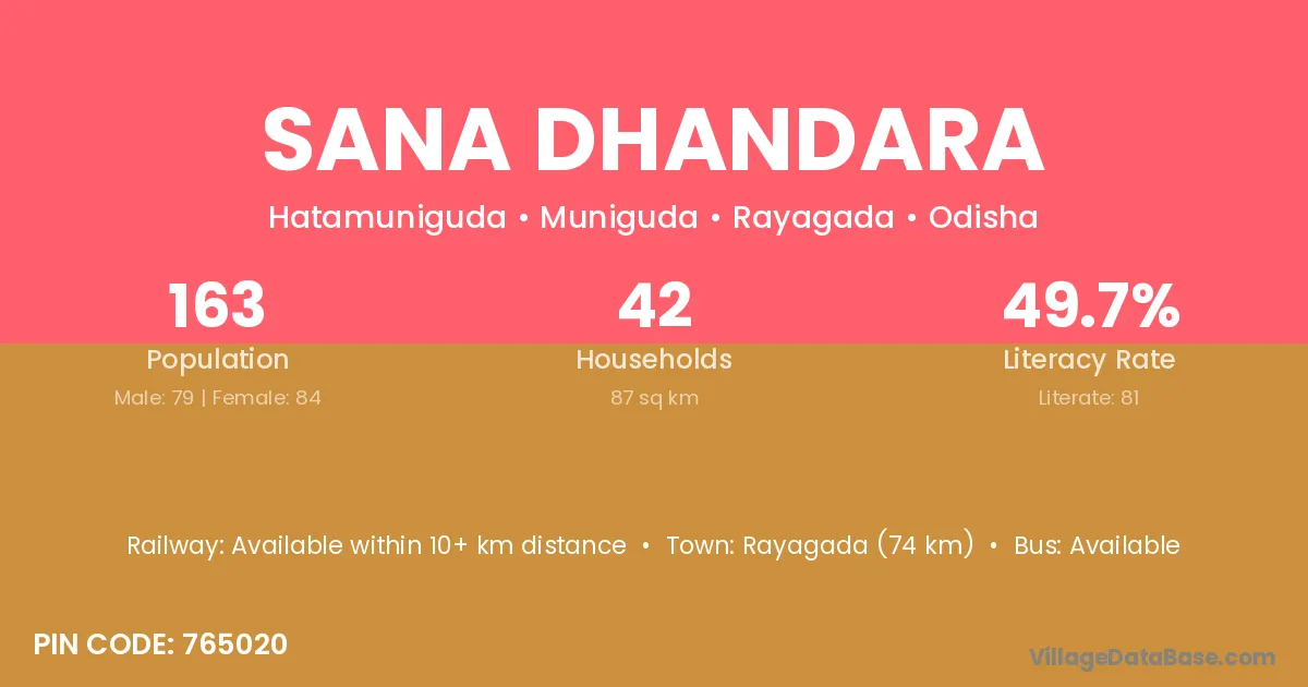 Rayagada (74 km) is the nearest town to Sana Dhandara village for major economic activities and is located approximately 74 km away.