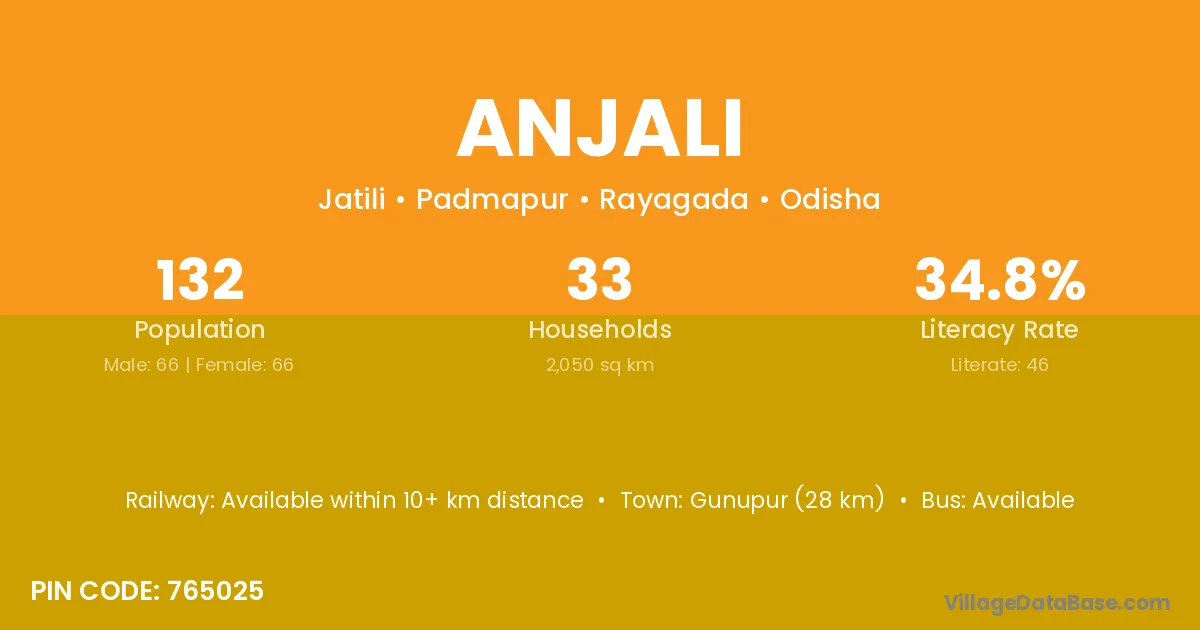 Gunupur (28 km) is the nearest town to Anjali village for major economic activities and is located approximately 28 km away.