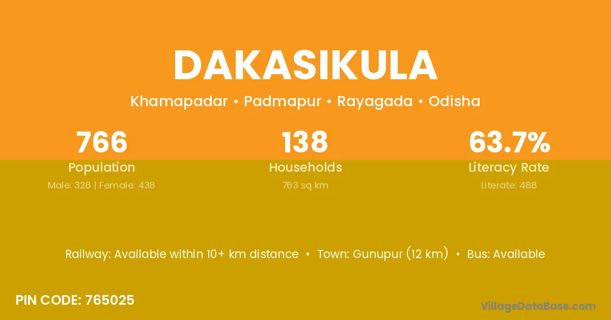 Dakasikula village has a total population of 766 people, of which 328 are males and 438 are females.