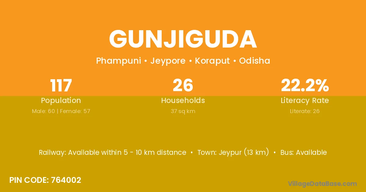 The literacy rate of Gunjiguda village is 32.47%. Male literacy stands at 42.11% and female literacy at 23.08%.