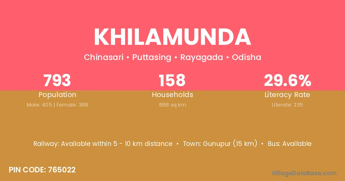 Gunupur (22 km) is the nearest town to Khilamunda village for major economic activities and is located approximately 22 km away.