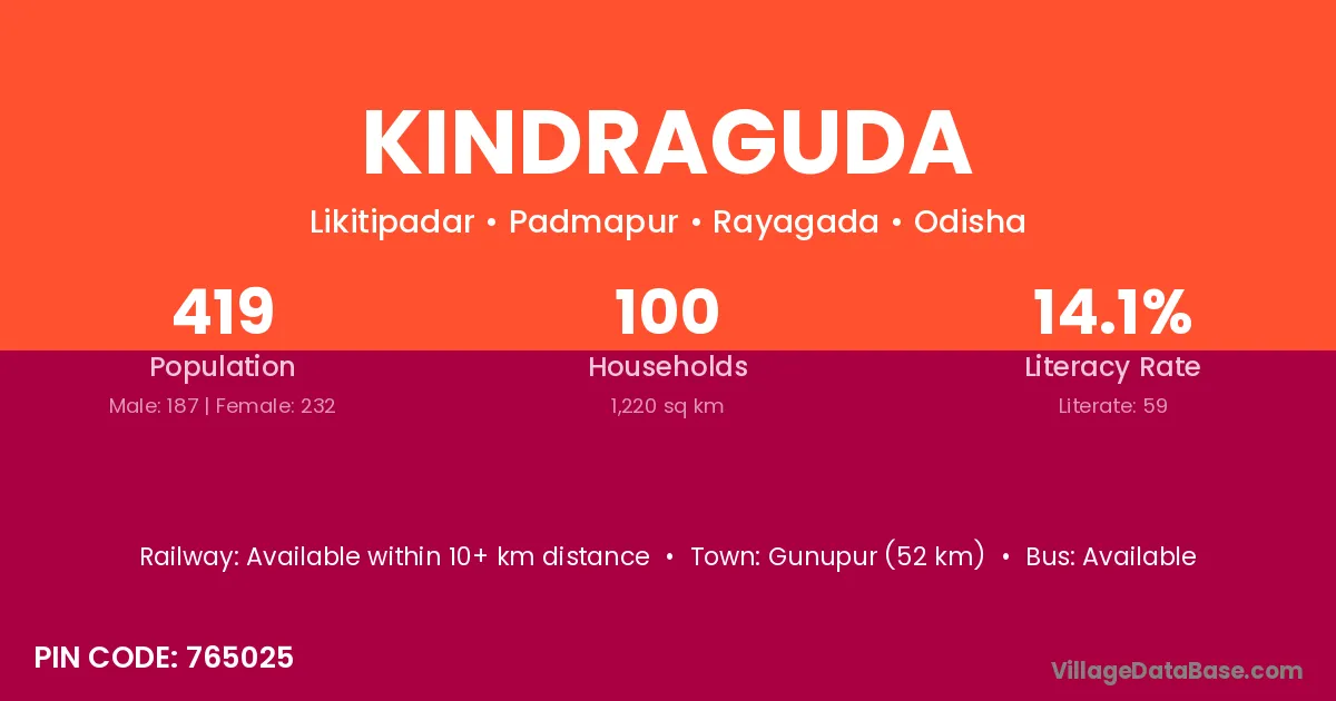 Gunupur (52 km) is the nearest town to Kindraguda village for major economic activities and is located approximately 52 km away.