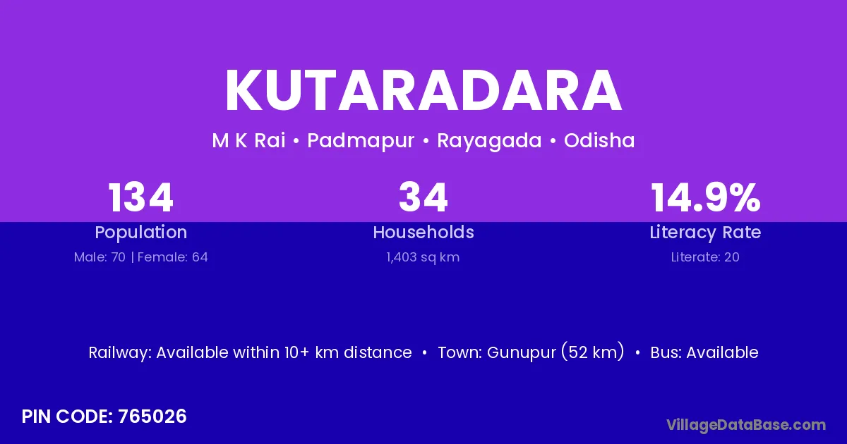 Gunupur (52 km) is the nearest town to Kutaradara village for major economic activities and is located approximately 52 km away.