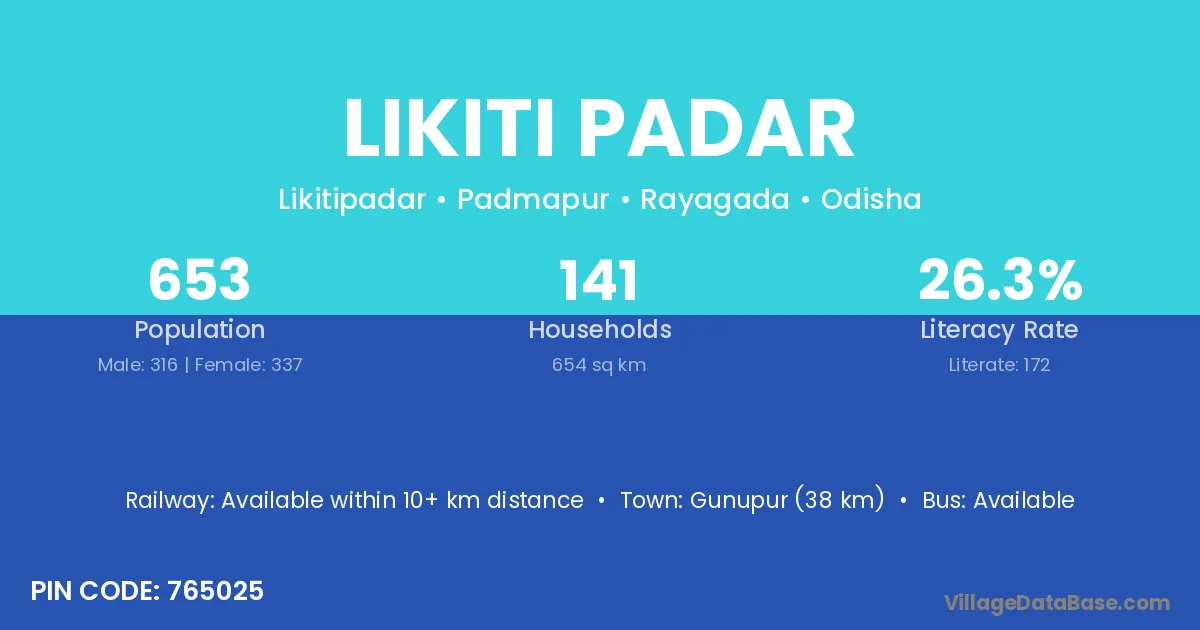 Gunupur (38 km) is the nearest town to Likiti Padar village for major economic activities and is located approximately 38 km away.