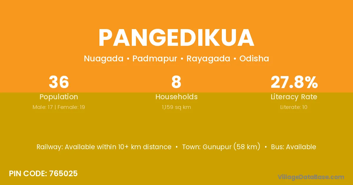 Gunupur (58 km) is the nearest town to Pangedikua village for major economic activities and is located approximately 58 km away.