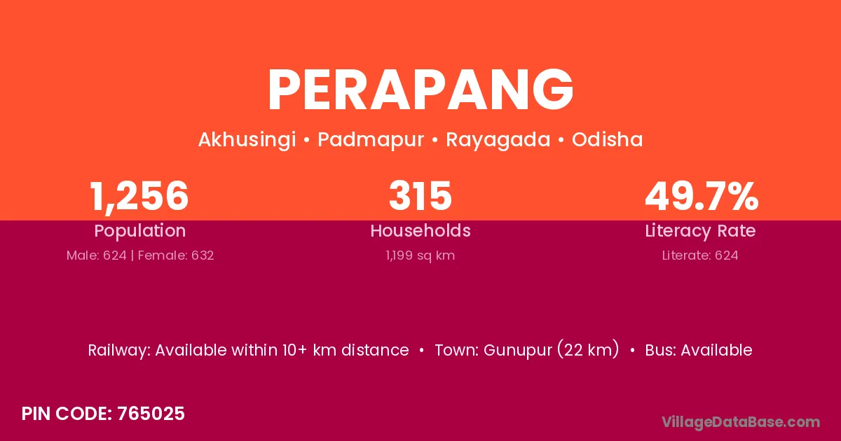 Gunupur (22 km) is the nearest town to Perapang village for major economic activities and is located approximately 22 km away.